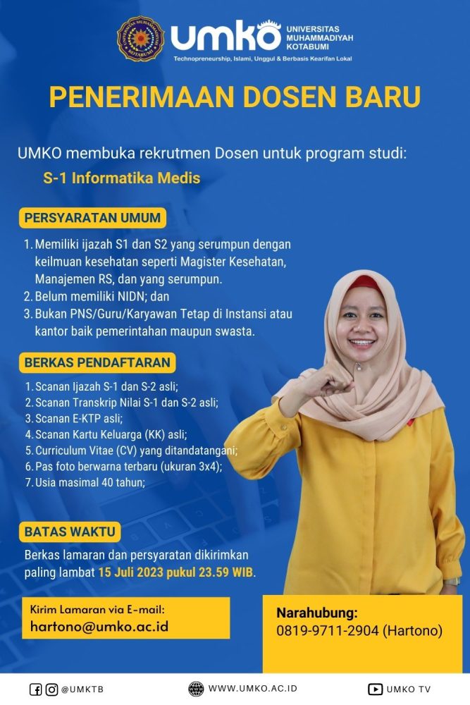 Fakultas Teknik dan Ilmu Komputer Universitas Muhammadiyah Kotabumi membuka lowongan dosen untuk program studi Informatika Medis dengan ketentuan sebagai berikut:
